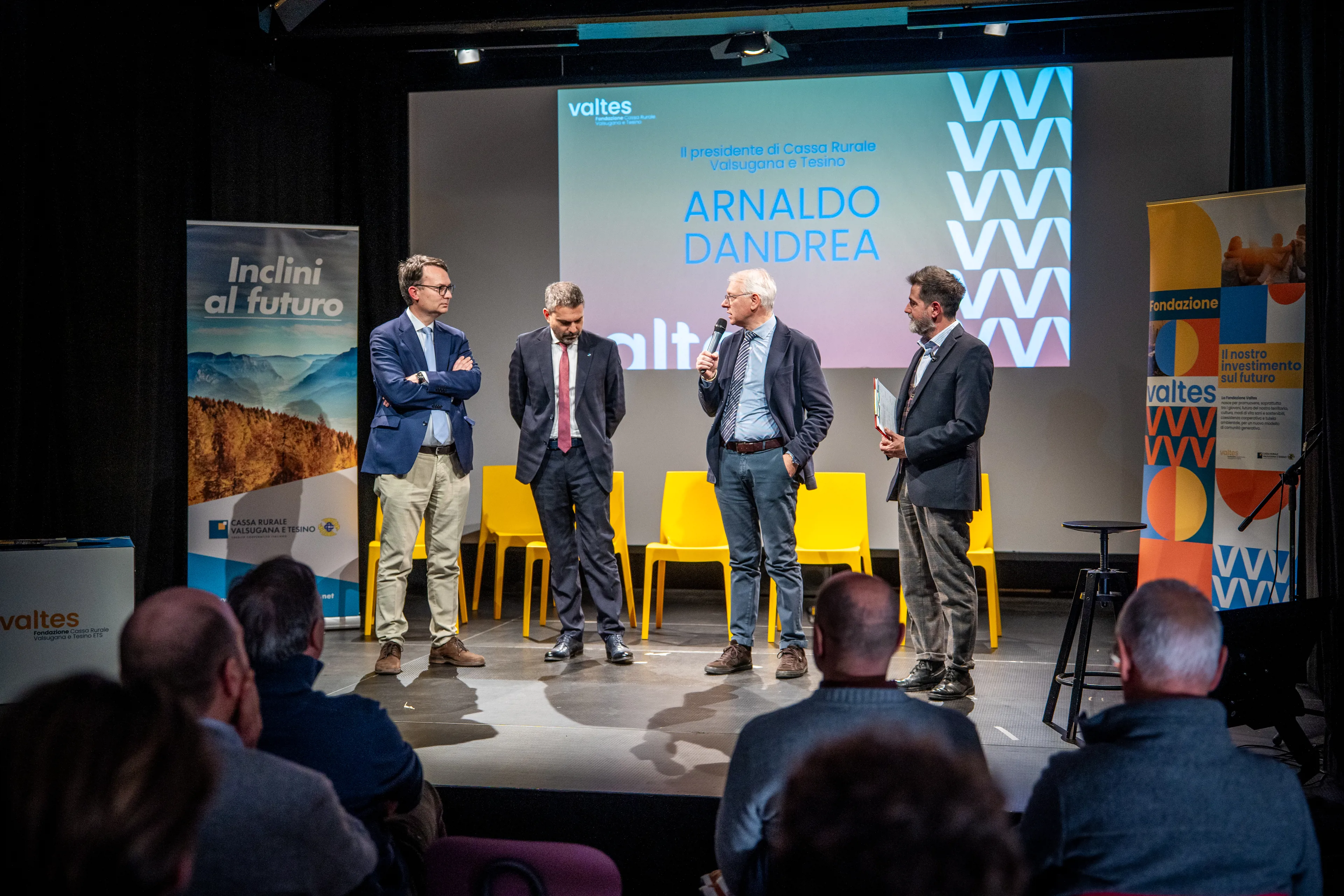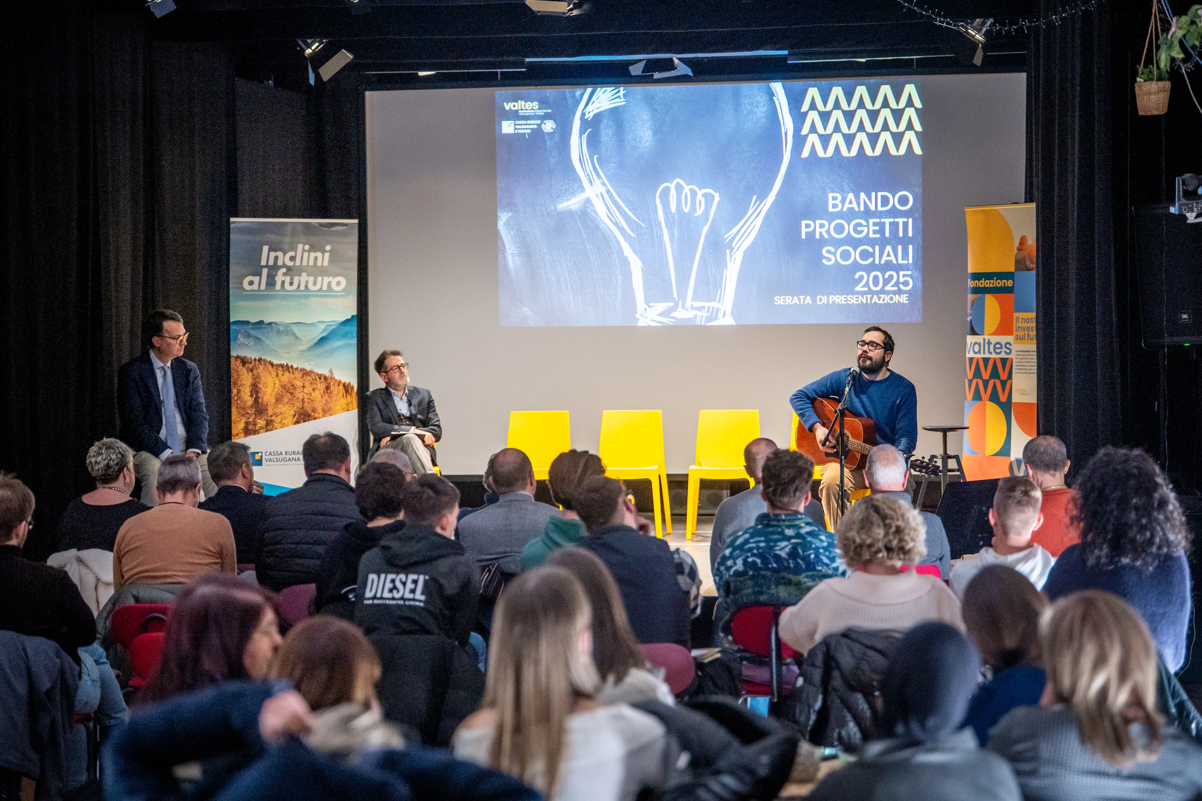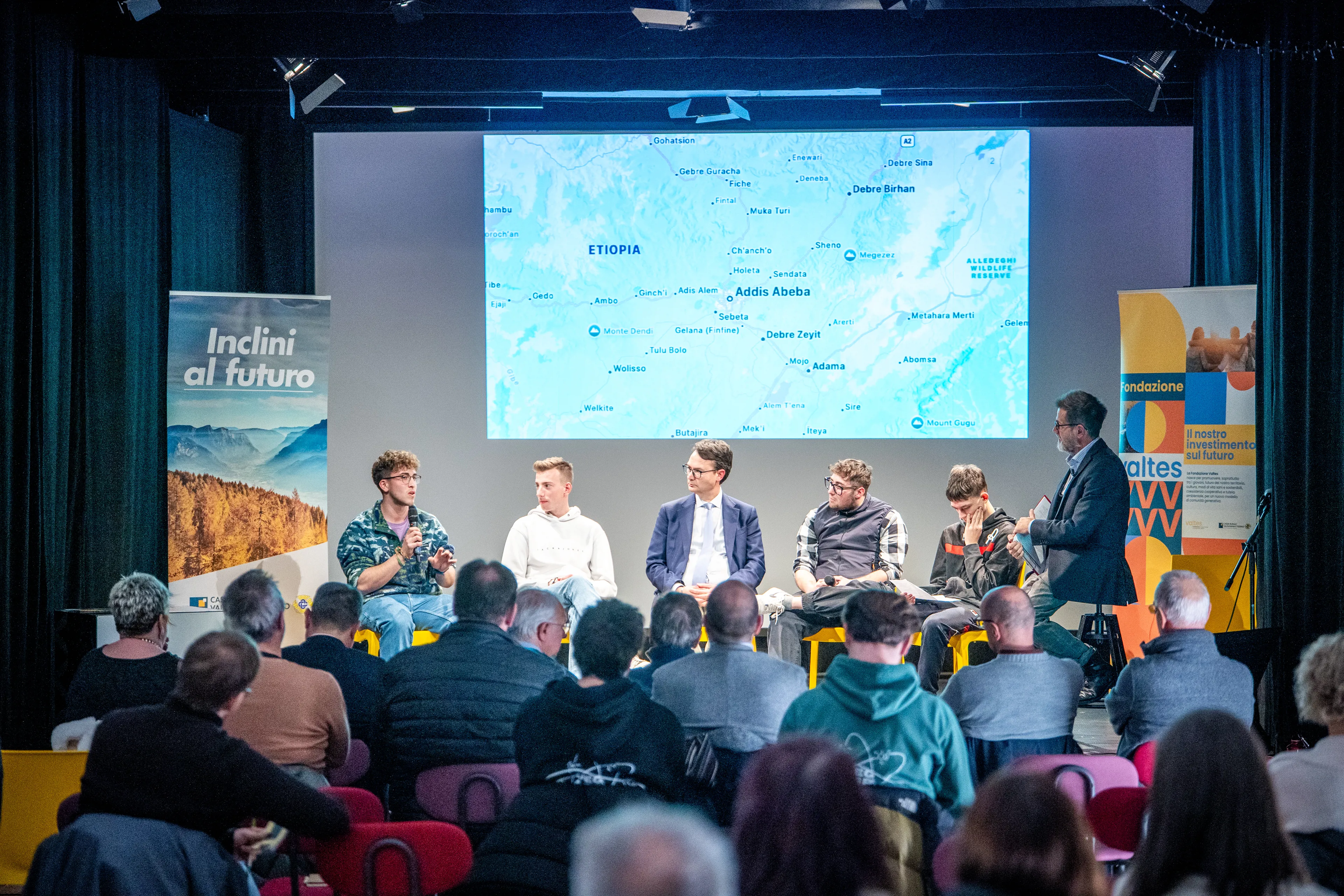 La serata è stata inoltre l’occasione, nella seconda parte, per una tavola rotonda, alla presenza sempre di Modena e di alcuni degli Alfieri del territorio che la Fondazione ha riconosciuto nel corso del 2025. Sono stati infatti coinvolti in questo momento di confronto Sebastiano Avanzo e Raffaele Rigo, che hanno presentato il progetto in corso con il centro di Addis Abeba “Testimony 2024”: un’iniziativa rivolta ai ragazzi over 16 che vogliano fare un’esperienza di cooperazione internazionale. Inoltre, Edoardo Libardi e Leonardo Zurlo, che hanno parlato del loro progetto contro il bullismo, attraverso la creazione di un “Social Space”, luogo sicuro di incontro e di gioco per gli studenti della scuola Enaip di Borgo.