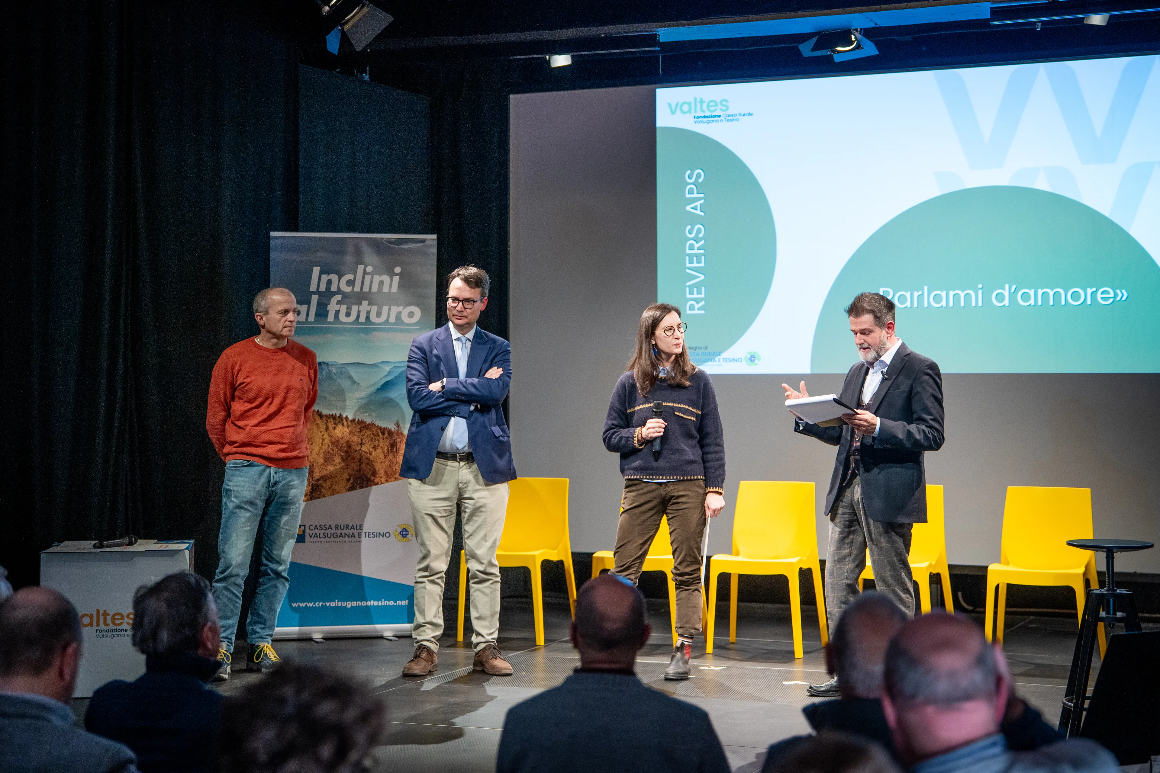 Sono saliti sul palco di Fonzaso l’Associazione Revers, come capofila del progetto Parlami d’amore. Il progetto si propone di sviluppare un film documentario sul tema dell’amore e sulla tenerezza, valori apparentemente scontati ma che rivestono oggi una rinnovata urgenza e diventano strumenti essenziali per leggere e comprendere il presente per costruire un futuro in cui gentilezza, rispetto dell’altro siano non solo sentimenti nobili, ma tradotti in pratica quotidiana.