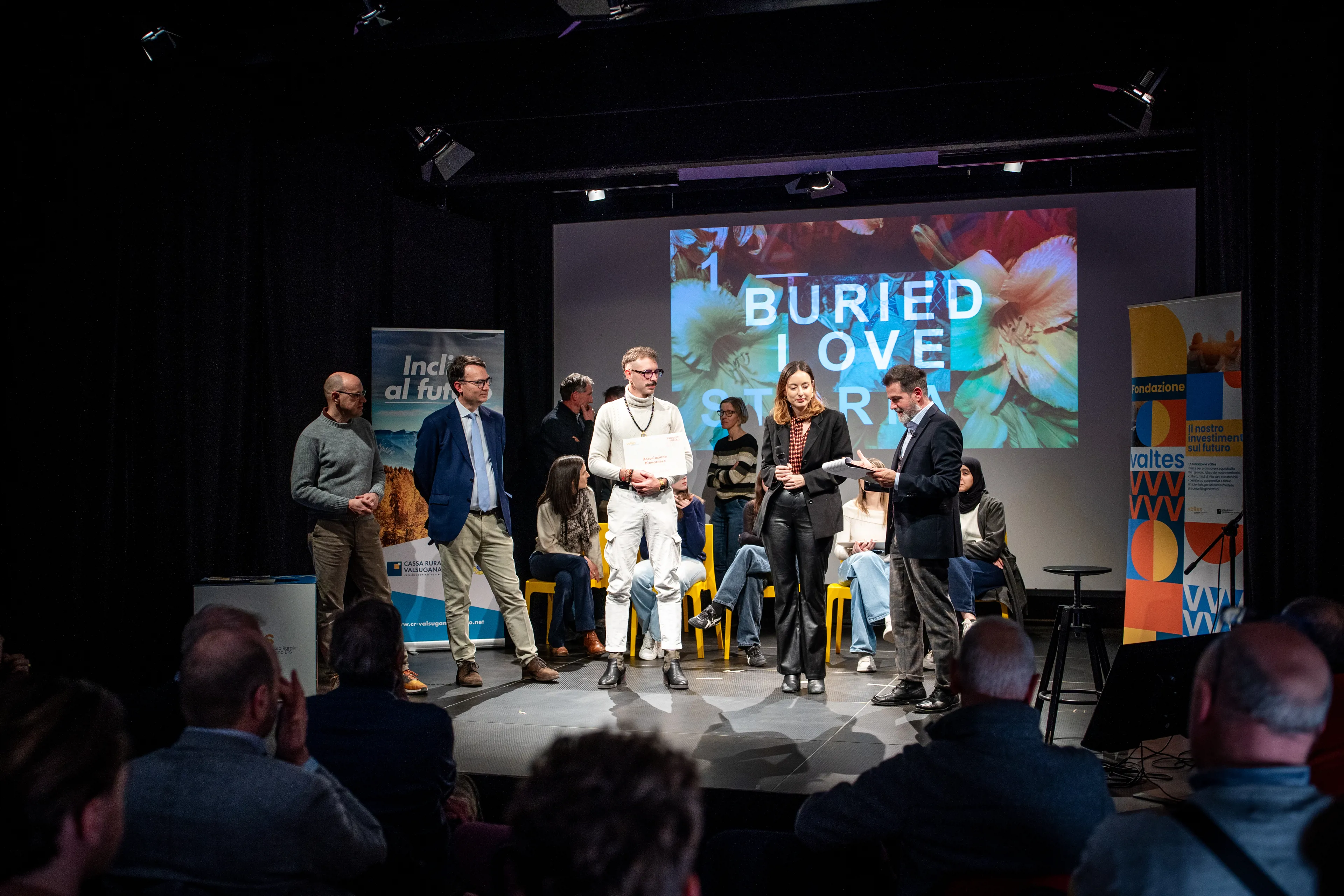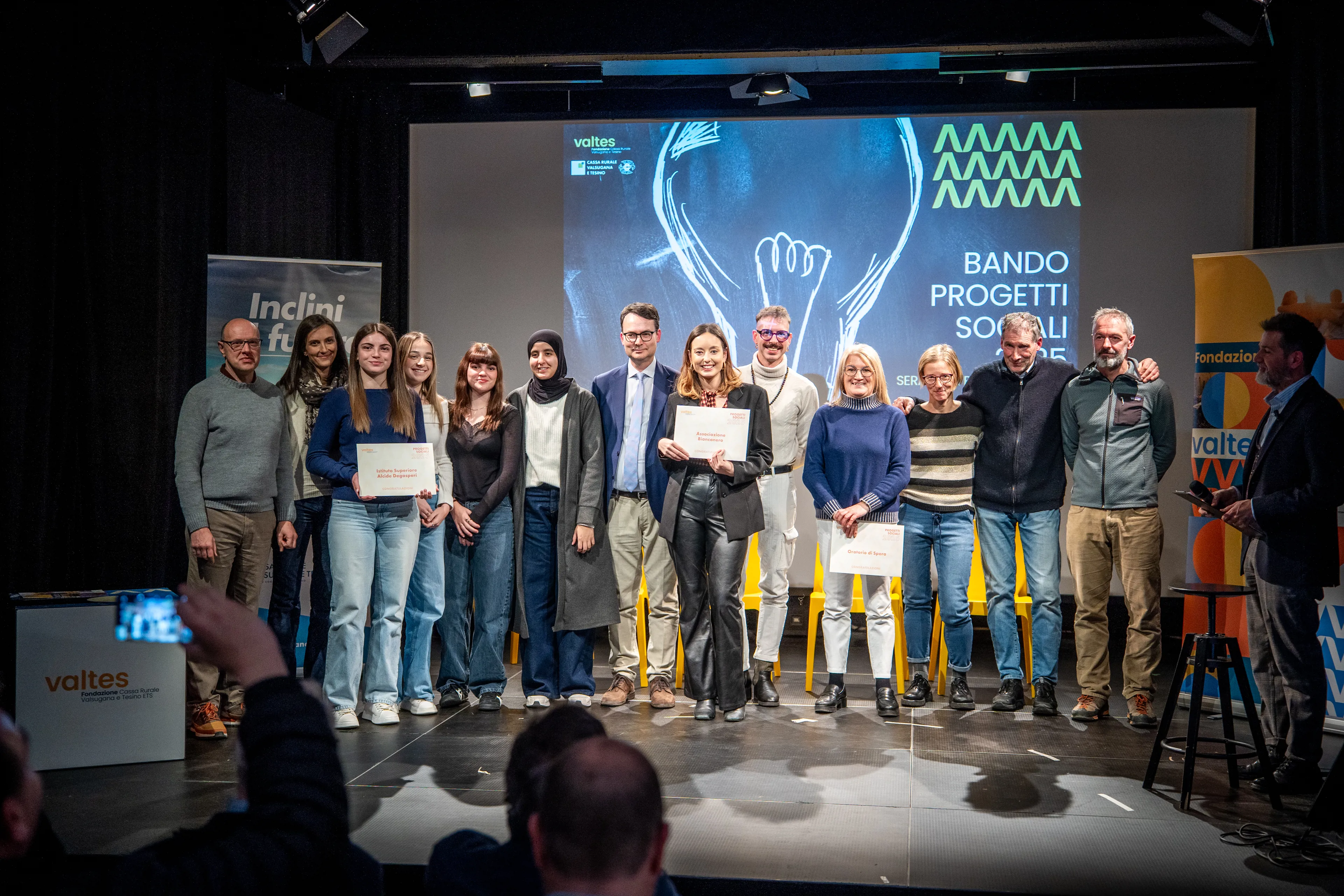 La serata è poi proseguita con la presentazione dei progetti Silver, che vedranno la realizzazione nel corso del 2026, quelli riconosciuti meritevoli sono stati Buried Love, proposto dall’associazione Bianconero, racconto di una storia rimasta in silenzio per oltre sessant’anni, di una donna della Valsugana che trova la forza, in età avanzata e sostenuta dalla nipote, di condividere la sua esperienza di un’infanzia segnata dalla violenza domestica. Inoltre, Trentino – Auf der Grenze, über Grenzen, promosso dall’Istituto Superiore Degasperi, sul tema dell’emigrazione e dell’immigrazione, fra elementi di memoria e di attualità, con la realizzazione di prodotti podcast e di un sito internet dedicato. Il terzo progetto finanziato in questa categoria è stato Su per i salti come na volta, capofila l’oratorio di Spera, che si propone di far rivivere, recuperare e valorizzare un antico sentiero di montagna che collegava Spera alle malghe in località Primalunetta, con la raccolta di testimonianze aneddoti e foto d’epoca che saranno messe a disposizione sul sentiero attraverso QRcode.